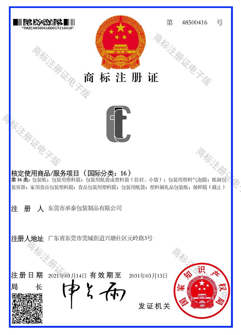 熱烈慶祝東莞市承泰包裝制品有限公司成功注冊《承泰》圖形商標(biāo)!